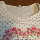 赤いバラのハートプリントとドット柄のフリル袖Tシャツ。