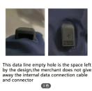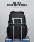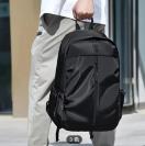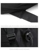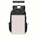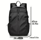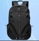 シンプルでスタイリッシュなブラックリュック、サイズは43cm x 28cm x 14cmで、比較チャート付き。