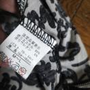 ベージュ地に黒の花柄デザインの五分袖トップス。