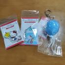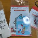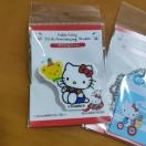 ハローキティの50周年記念アクリルバッジとキーホルダーセット。