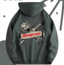フロントにSnap-onロゴ、バックに工具デザインのグレーのフード付きパーカー。