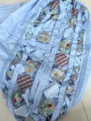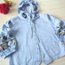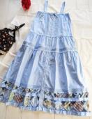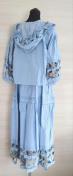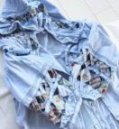 キャミロングワンピの裾やジャケットブラウスの袖口には花柄やチェック柄、ギンガム柄等の四角パッチワークの繋ぎとクロスカットワークデザイン、フードにはクロスカットワークデザインでそれぞれ一つ一つにはサックスのピコット刺繍が施されております。フードの紐は絞ることが出来、強く絞るとよりフリルフードになります