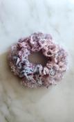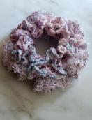 ラメ入りグラデーション糸とひらひらテープの変わり糸でダブルフリルのシュシュを編みました。