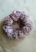 フリルの上下で編み方や素材を変えて、ボリュームたっぷりのモフモフ可愛いシュシュに仕上げました。
