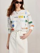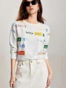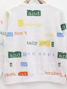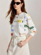 レディース オーバーサイズ文字プリントセーター - ホワイトにマルチカラーブロックレター(グリーン、イエロー、ブルー、オレンジ、レッド、ブラック、ブラウン、ピンク、パープル、グレー、ベージュ)- ソフトラウンドネック長袖カジュアルセーター春/秋の重ね着用に、日常&フォーマルな服装に最適 - おしゃれで遊び心あるテキストデザインとトレンディなオーバーサイズフィット、ドライクリーニング専用、ファッショナブルな女性向けスタイリッシュセーター