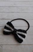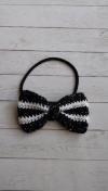 シルバーラメ入りブラックとホワイトのレース糸を使ってリボンモチーフを編み、ヘアゴムを作りました。