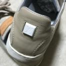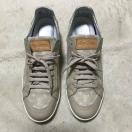 ベージュモノグラムのコットンで、ベロにレザーのパッチ、両踵にルイヴィトンのエンブレムが付いています。