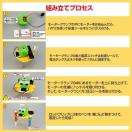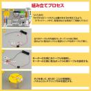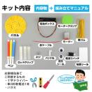 キット内容:組み立てマニュアル、組み立てキット(パネル、電池ボックス、赤ケーブル、モーター、モータークランプ、輪ゴム、ペン、ロッドクリップ、ネジ、ハンドル、目玉シール、電源スイッチ、粘着シール)