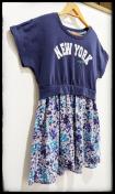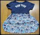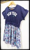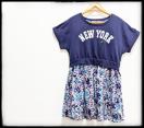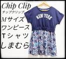 色はTシャツ部分は紺色でアルファベットのプリント有り、スカート部分は青系の柄物、サイズはMサイズ、バスト79から87、身長154から162と記載あります。