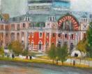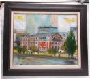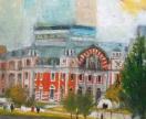 中之島の難波橋から土佐堀川河畔の大阪市中央公会堂 (通称 中之島公会堂) を望んだ作品である。川沿いに映えるネオ・ルネッサンス様式の化粧赤レンガ。表現主義的に質感のある明快な筆致で描きました。 (金山ヒロシ)締切日時