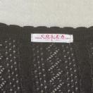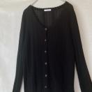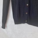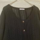 レース編みのブラックカーディガン、ゴールドボタン付き、Vネックデザイン。