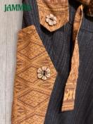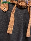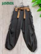 前ウエストにアジアン柄のベルトループとココナッツバックル付きの飾り紐、左右のポケット口に飾りフラップ付き。