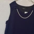 ネイビーのパールネックラインパーティードレス、Lサイズ、フレア裾デザイン。
