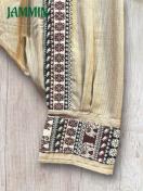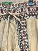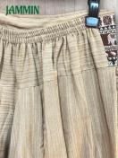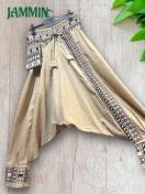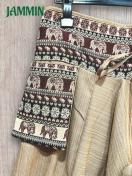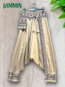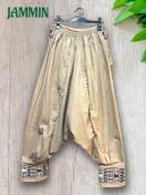 前ウエストと右前のポケット口、左前と裾にアジアンな織り柄生地付きのサルエルパンツです。