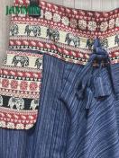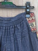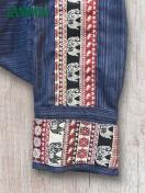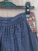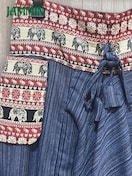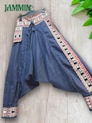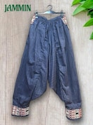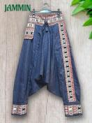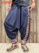 前ウエストと右前のポケット口、左前と裾にアジアンな織り柄生地付きのサルエルパンツです。