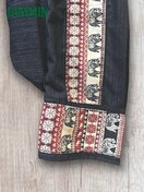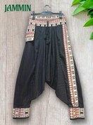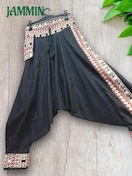 前ウエストと右前のポケット口、左前と裾にアジアンな織り柄生地付きのサルエルパンツです。