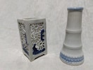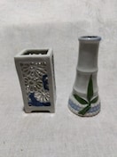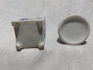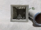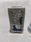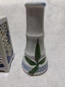 釉薬のかかってないところが1ヶ所と釉薬ぎれか製造時のくっつき跡のものが1ヶ所あります。竹型の筒は多分線香立かと思われます。キズはありません。口の内径2.3a 高さ12aです。締切日時