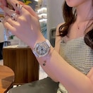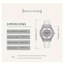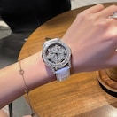 透明な裏地のスタイリッシュな女性用時計。回転式の星空ダイヤルと雪片柄のデザインを特徴としています。ステンレススチール製のケースとホワイトファーケースレザーストラップを備えており、デートに最適で、日常の着用に適しています。