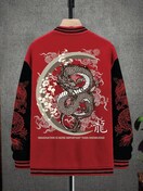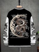 メンズ フリース裏地 ドラゴン刺繍 ベースボールジャケット 軽量 暖かい スナップボタン 洗濯機対応 グリーン イエロー リブ編み袖口 季節用コート