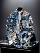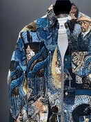 メンズカジュアルストリートウェア - 長袖シャツ、抽象油絵の刺繍、ブルー&ゴールデンデザイン、ボタンヘイジャケット、洗濯機洗い可能、オールシーズンで使えるアウトドア、ハイキング、パーティー、日常着用に最適な多用途の服 | 芸術的な刺繍 | 弾性なしの素材