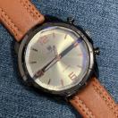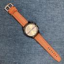 シルバーの文字盤に茶色のレザーベルトを採用したカジュアルなアナログ腕時計。