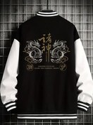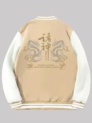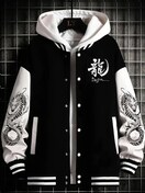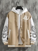 メンズカジュアルスポーツジャケット、ドラゴン幾何学模様、栗黒カラーブロックデザイン、ボタン留め、伸縮性のある生地、オールシーズンコート