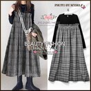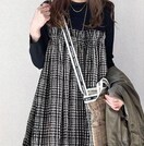 ┗重ね着風の胸元ギャザーが一際目を引くベアトップ風の可愛いチェックワンピース