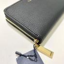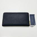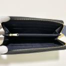 ブラックにゴールドのロゴがポイントの上品な長財布。外見がスッキリとした印象のラウンドジップタイプで紙幣やカードも多く収納できます。お手入れが簡単で、水にも強いフェイクレザーを使用。