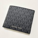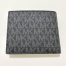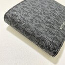 PVCコーティングキャンバスのシグネチャー柄とレザーで仕上げたスタイリッシュな二つ折り財布です。コンパクトながら大きく開く札入れにカードポケット・小銭入れなど収納力も高く、ポケットやバッグに入れてもかさばらない大きさです。