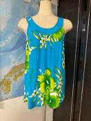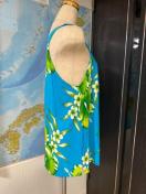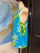 鮮やかな青色にハイビスカスと花のプリントが施されたフラダンス用タンクトップ。