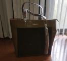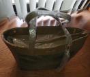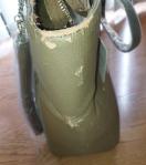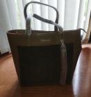 グレーがかったオリーブグリーンの合成皮革トートバッグ、タッセル付きでジッパー開閉。