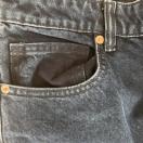 ブラックのストレートレッグマムジーンズ、バックポケット付き。
