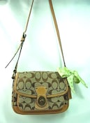 COACHの人気モデル「F10566」より、シグネチャー柄のショルダーバッグを出品いたします。キャンバスジャガード×本革レザーのコンビ素材で、斜め掛け可能な実用的なサイズ感。リボンスカーフ付きで、コーディネートのアクセントにもなる可愛らしいデザインです。