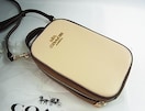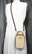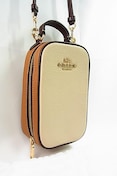 【カラー】アイボリークリーム系 × ブラウン(カラーブロック) 【素材】本体:本革レザー × キャンバス/金具:ゴールドトーン 【サイズ(約)】 ・本体:横11cm × 縦18cm × マチ6cm ・ショルダーストラップ:112〜127cm(調節・取り外し可能)