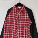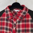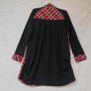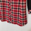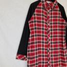 赤と黒のチェック柄のシャツワンピース、ラグランスリーブデザインでスタイリッシュ。
