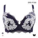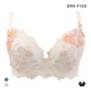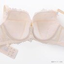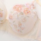 下カップのレースには繊細に輝くラメ糸を散りばめ、アイキャッチとなる華やかなアップリケをバランスよくふんだんにあしらった、優雅で贅沢なデザイン。色とりどりに咲き誇るお花のモチーフとアップリケの重なりが、美しくロマンティックです。透け感のある上品なアップリケを添えることで、高貴でエレガントな印象に仕上げました。