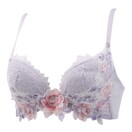 カップ脇のレースには繊細に輝くラメ糸を散りばめ、アップリケをふんだんにあしらった優雅で贅沢なデザイン。色とりどりに咲き誇るお花のモチーフとアップリケの重なりが、ロマンティックで優美な印象を与えます。