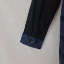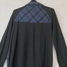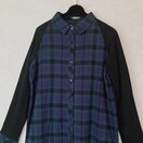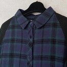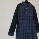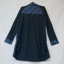 ネイビーと黒のチェック柄のシャツワンピース、ラグランスリーブデザインでスタイリッシュ。