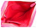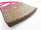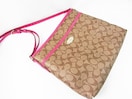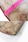 ブラウン(茶色)系のシグネチャー柄に、鮮やかなピンクのレザーがトリミング(縁取り)として施されています。内部はピンク系の布地です。