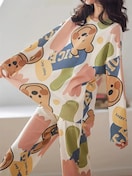 キャラクターベアプリントパジャマセット、長袖ラウンドネックトップとベアパンツ、秋冬用レディーススリープウェア・ルームウェア