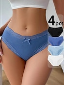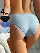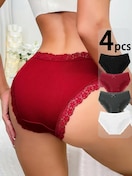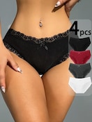 4枚セット セクシーで快適なストレッチパンティー、レーストリム付きリブ編み女性用下着、日常使いに最適なソフト素材の無地パンツ