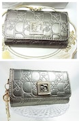 本体は光沢のあるガンメタリックシルバーです。内部はベージュとホワイトです。金具はゴールドとシルバーです。