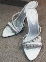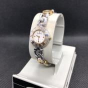 本体は光沢のあるガンメタリックシルバーです。内部はベージュとホワイトです。金具はゴールドとシルバーです。