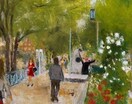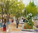 淀屋橋から肥後橋に続く土佐堀川沿いの中之島遊歩道を描いた作品である。土佐堀川は天神橋のところで堂島川と共に大川から分枝したものであるが、その川の堤防が中之島公園の遊歩道として整備されている。所々、並木の道端には大きな彫刻が置かれ、季節の花やバラの植え込みなどがある。白いバラの植え込み、若葉の樹林が茂る緑道の初夏の情景を表現主義的に明快な筆致で描きました。(金山ヒロシ)