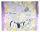 **ラベンダー/パープル(薄紫色)**のベースに、ペンギンや雪の結晶はグレー/白、装飾はイエロー/ゴールド系です。