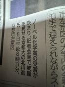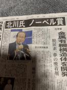北川先生は、分子科学研究所の研究顧問のほか、2004年から2006年には名古屋大学の非常勤講師を務められるなど、ここ愛知でも化学者の育成や化学分野の発展に御尽力いただいており、この度の受賞は、愛知で日々研究に取り組む研究者や次代を担う学生たちに大きな勇気や希望を与えるものです。これを記念にこの新聞を保管してみては如何でしょうか。