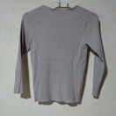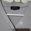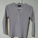 リブ編みのグレーの長袖カットソー、ボタン付きのVネックデザイン。