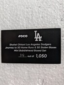 大谷選手の50/50達成記念の4.5インチボブルヘッドの6体セットです。内訳は30/30,40/40,50/50それぞれのバッターとピッチャーのボブルヘッド合計6体セットです。訳アリで50/50のバッターのボブルヘッドの後ろの50/50の表示のプレートの根元が欠けてしまっている(瞬間接着剤でくっつける事は可能)為.相場より2000円位安くしました。10枚目の画像ではバットを持っていませんが顔が隠れる為.取り外し可能な為.外しました。8枚目の画像でわかる通りバッターの数と同じ3本ちゃんと有ります。36500円スタートで値下げ有りです。佐川急便発送ですが即決(37371円)の場合は送料を900円引きします。締切日時