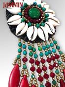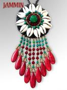 シェル(宝貝)やストーンビーズ、ブラスビーズ、ハウライトターコイズなどを使った太陽ネックレスです。