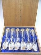 【状態】未使用・自宅保管品 ・スプーン:個別包装あり/光沢良好/傷なし 木の箱ふたに金文字「叙位・叙勲記念 浅川汪介」入り